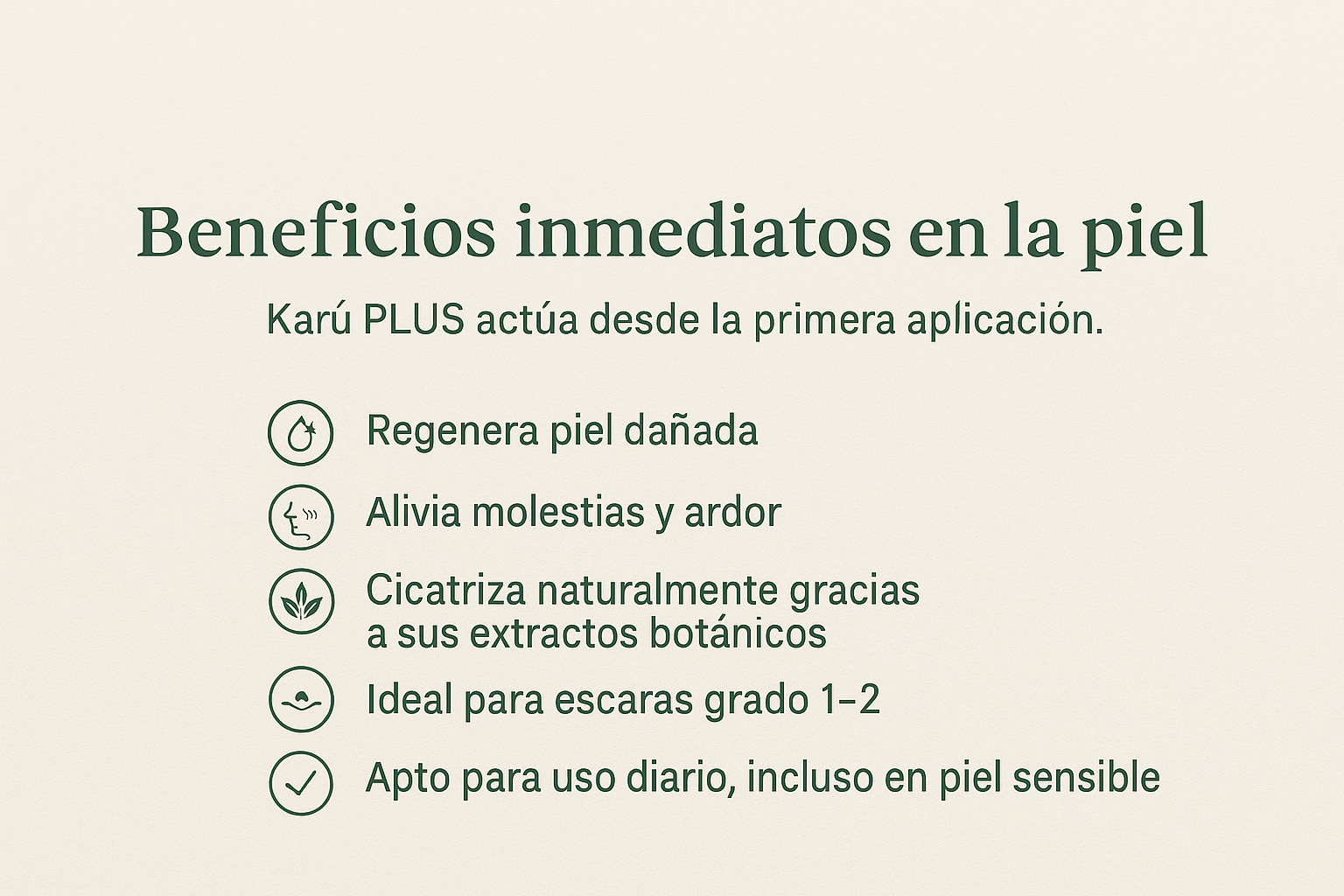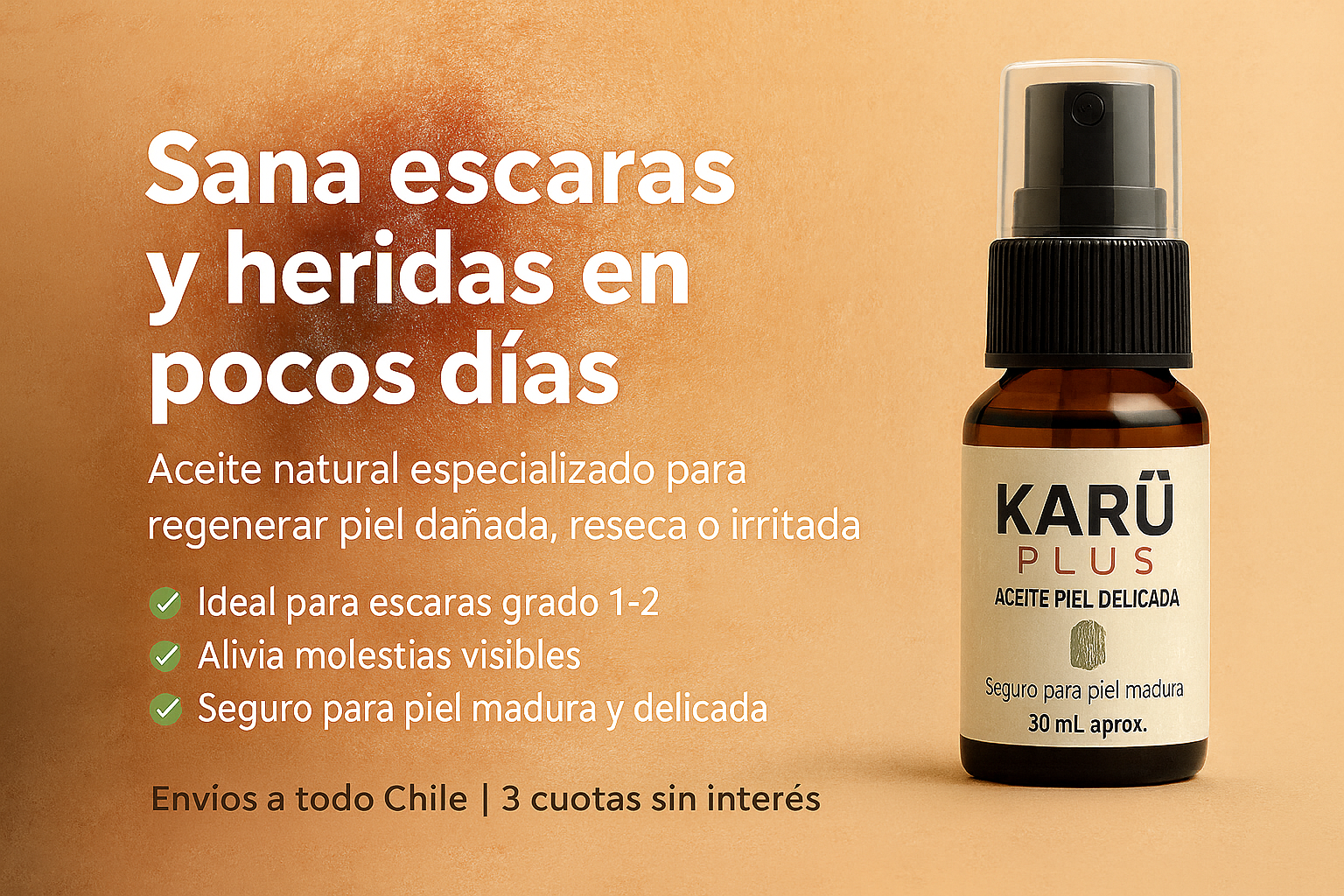 No. Karü es un aceite regenerador natural, diseñado para apoyar la recuperación de la piel. No sustituye tratamientos médicos.