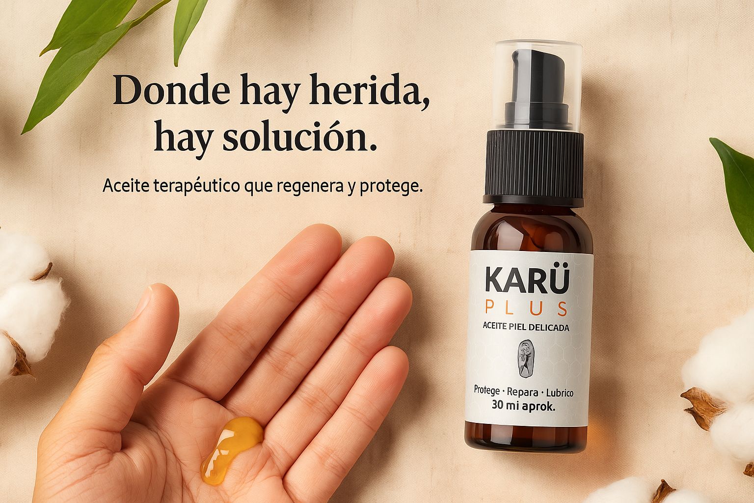El aceite KARÜ actúa profundamente sobre la piel dañada, favoreciendo la regeneración celular y cicatrización de heridas tipo escaras grado 2. Su fórmula con extractos naturales y ácidos grasos esenciales reduce la inflamación, alivia el dolor y restaura el tejido cutáneo desde la raíz.